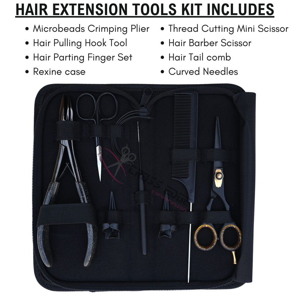 Kit d'outils pour extensions de cheveux de salon avec pinces à sertir plates, crochet de tirage, aiguilles courbées pour extensions, coupe-fils et ciseaux de barbier