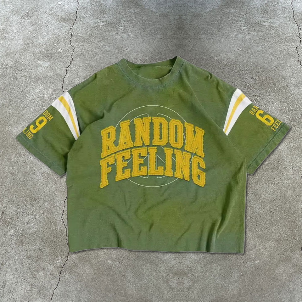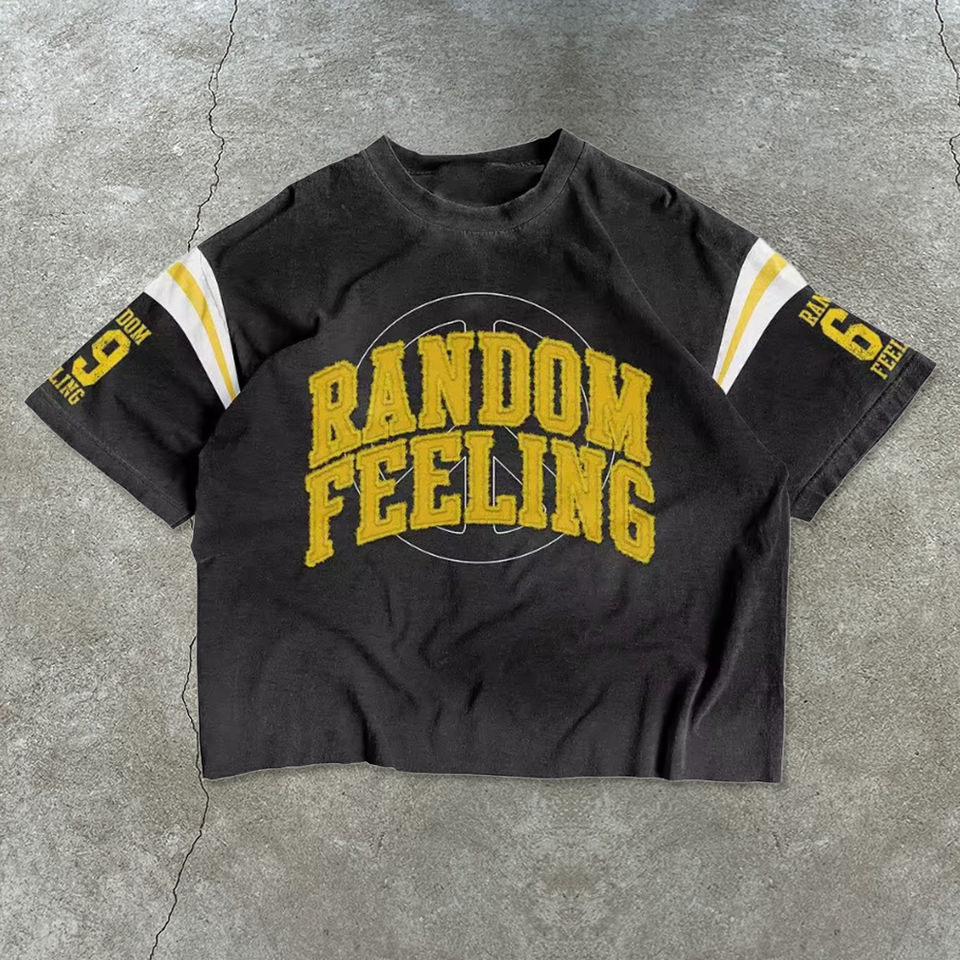 T-shirt oversize vintage en coton délavé à l'acide, à épaules tombantes, style streetwear, avec appliqué sur la manche et rayures sur le devant, échantillon disponible
