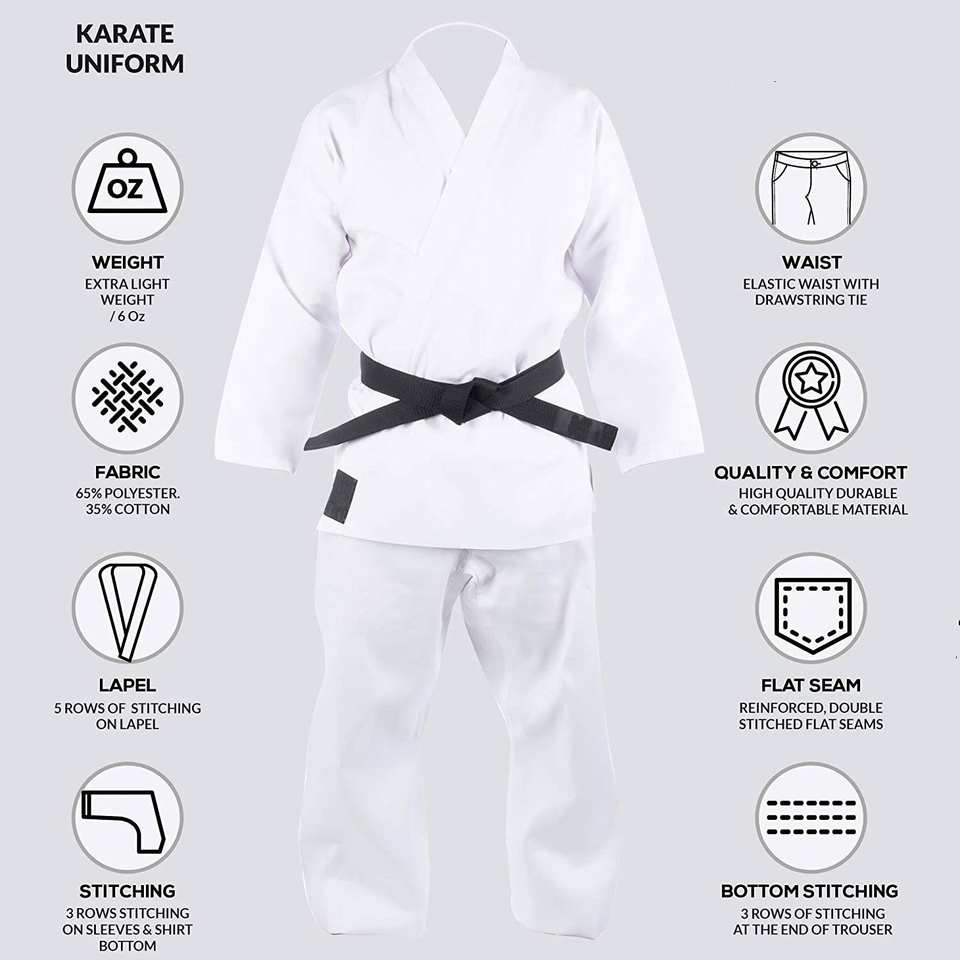 Échantillon Gratuit Livraison Gratuite Vente Chaude Logo Personnalisé Vente en Gros Vêtements d'Arts Martiaux Pas Cher Karategi Combinaison de Karaté Uniforme de Karaté en Promotion