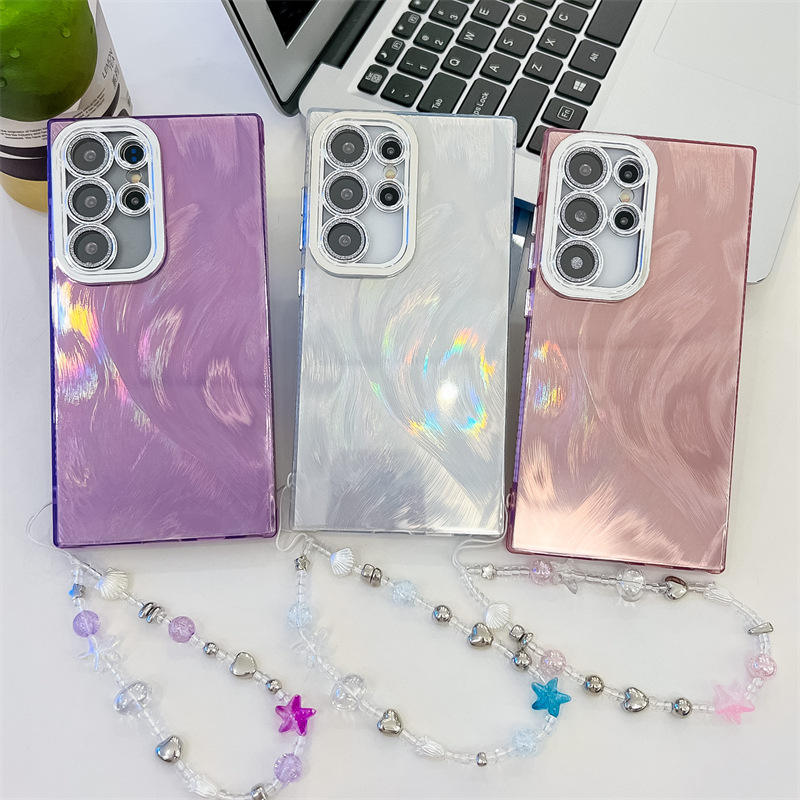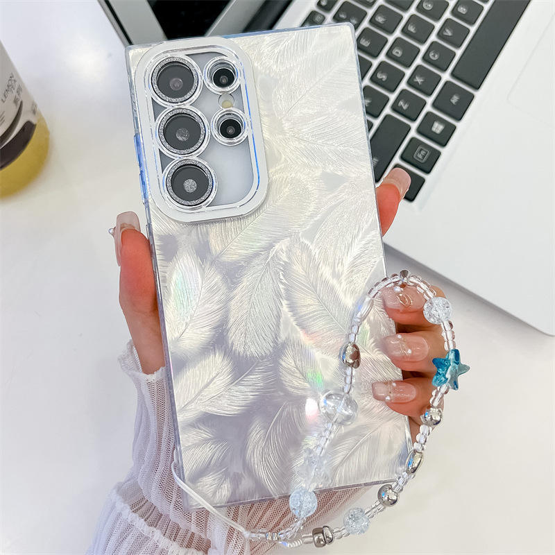 Étui de téléphone Samsung S24 Ultra, coque exquise effet plume avec chaîne de suspension anti-perte A16 A36, étui de téléphone en TPU antichoc