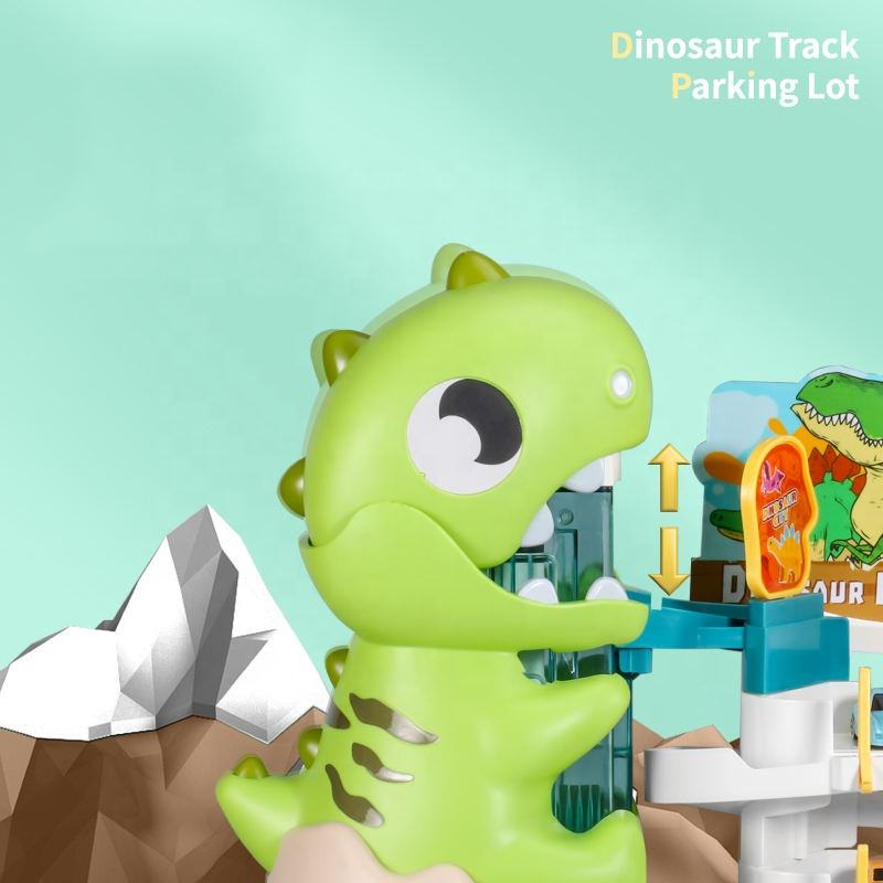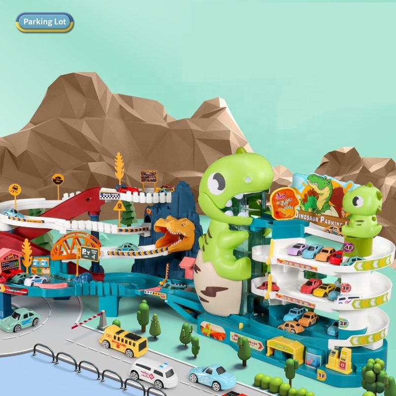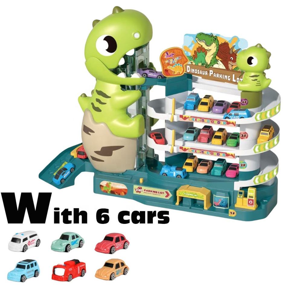 Samtoy Voiture Aventure Jouet Véhicule Garage Jouet Dinosaure Course Voiture Piste Rampe Parking Jouet pour Garçons avec 6 Mini Voitures