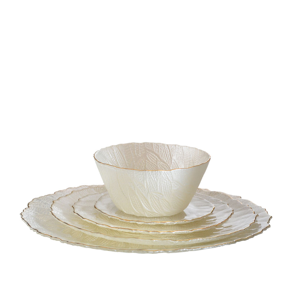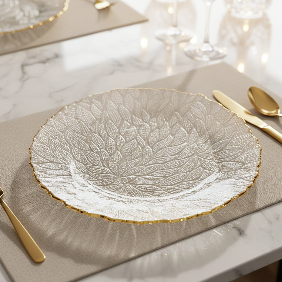Assiette de présentation ronde en verre avec bordure perlée dorée
