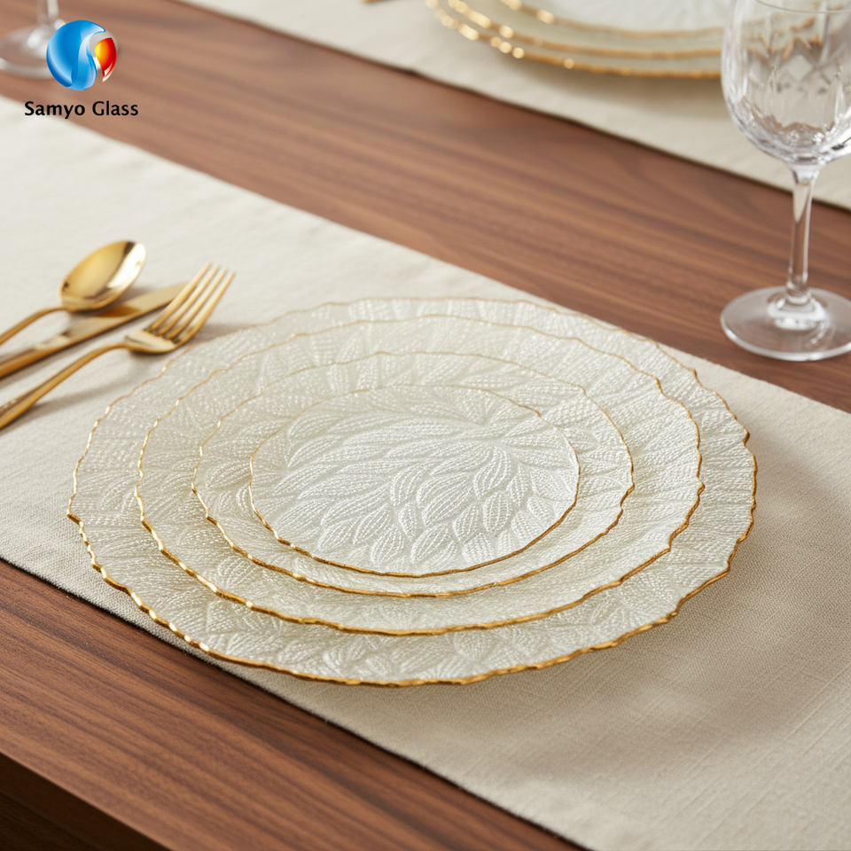 Assiettes de présentation en verre à bord doré personnalisées Samyo pour la décoration de tables de mariage, d'hôtels et de fêtes