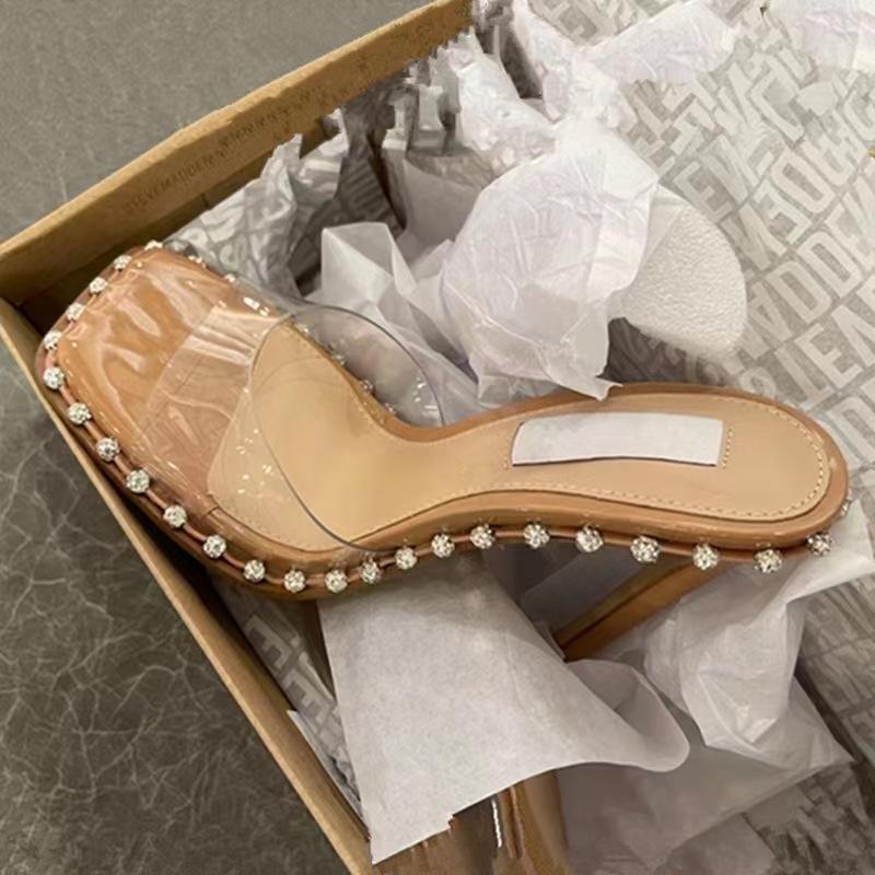 Sandales à bout carré, talons hauts, sexy, à bout ouvert, fines, chaussures pour femmes, semelle en bois, escarpins transparents, nouveau PU caoutchouc, 1 paire