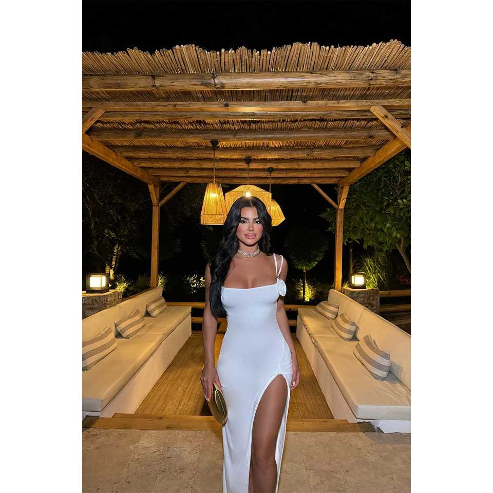 Robe de bal blanche Sandra Rose, technique crochetée, bretelles spaghetti, manches brodées de fleurs, XS, longueur genou, coupe droite