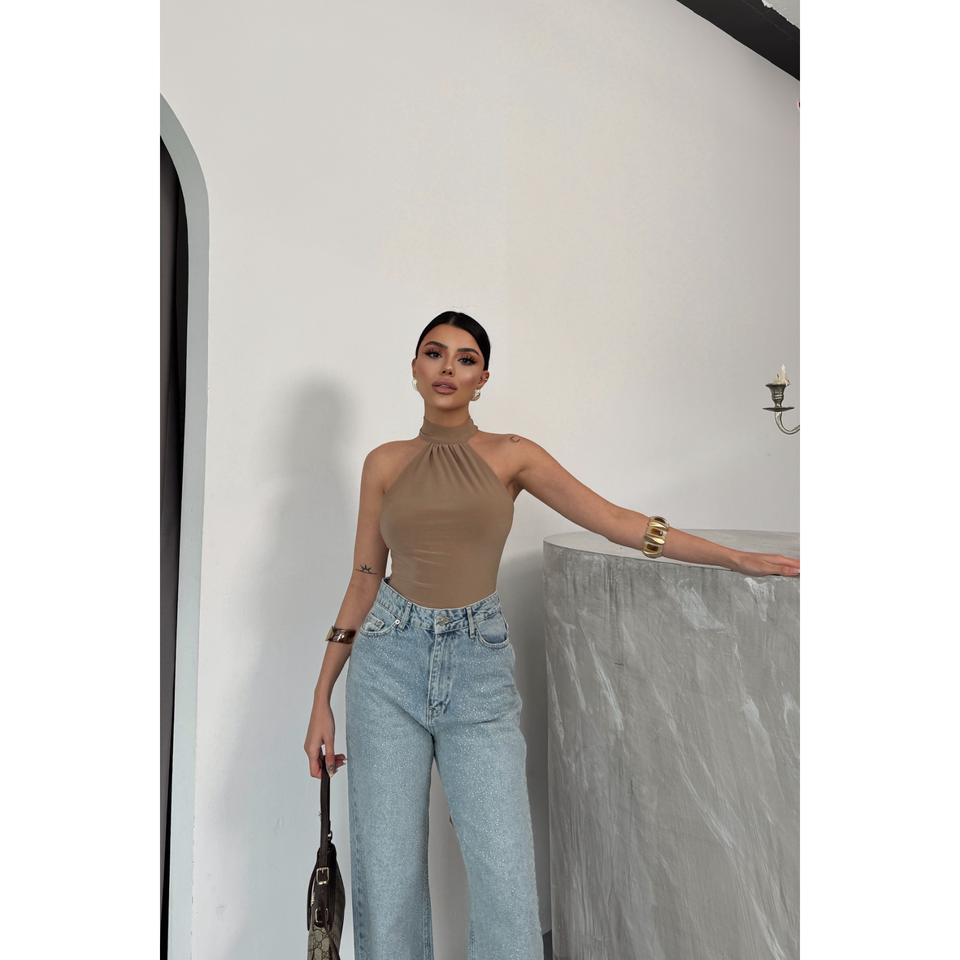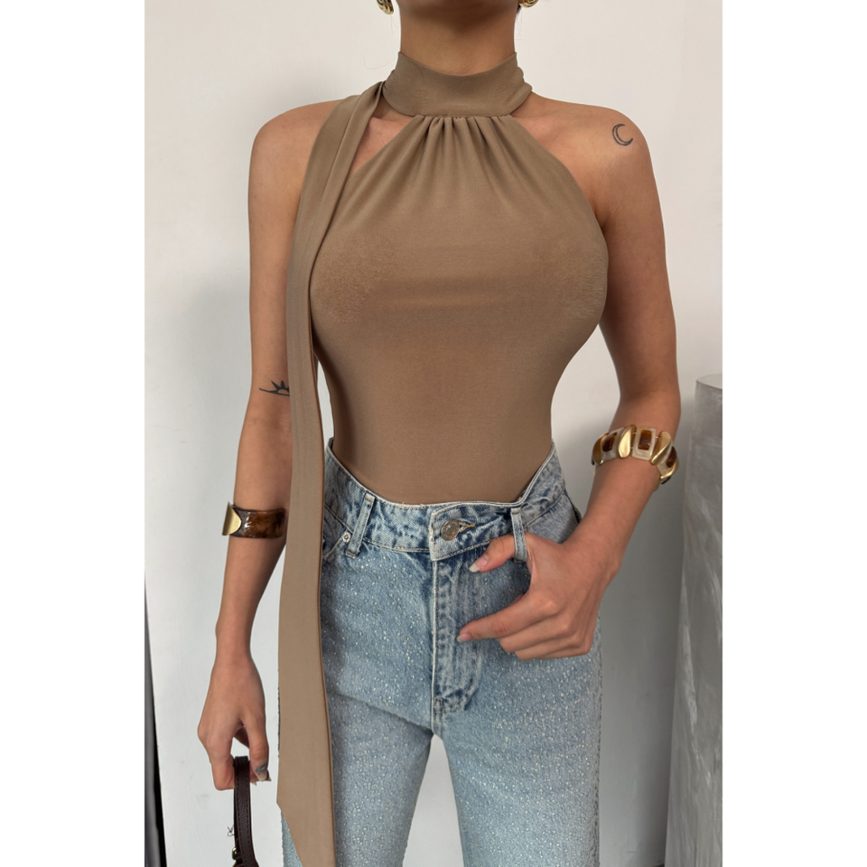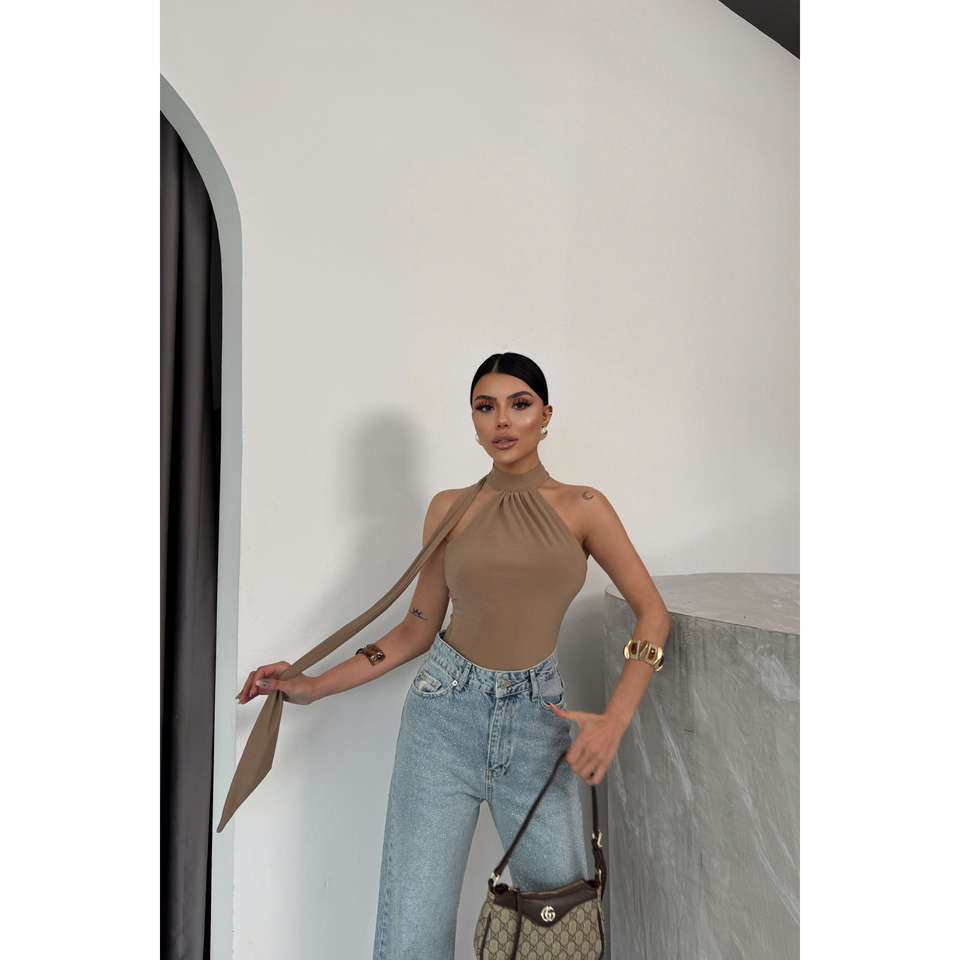 Body Halter Sandy Imprimé Sexy Beige Coupe Ajustée en Tissu Tricoté Longueur au-dessus du Genou pour la Saison Automne