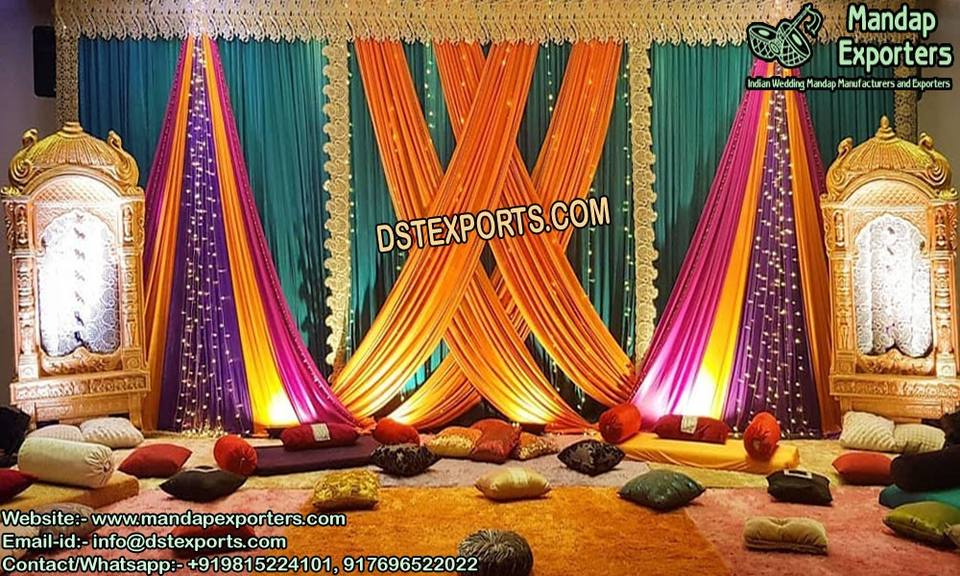 Sangeet scène plissée Lehariya décors belle scène Mehndi rideaux colorés extérieur Mehndi configuration avec rideaux de toile de fond