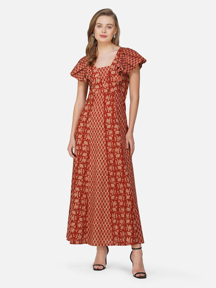Sati Factory femmes rouille rouge imprimé fleuri Maxi robe décontracté été robe de bal avec manches flottantes col carré cheville longueur