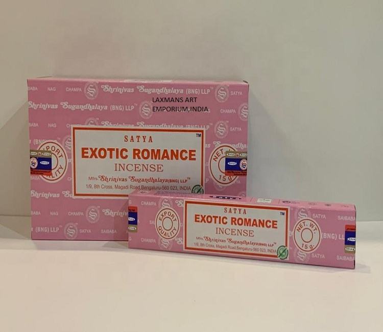 Bâtonnets d'encens Satya Exotic Romance Masala roulés à la main paquet de 15 grammes fournisseur en gros de l'Inde Satya encens en gros