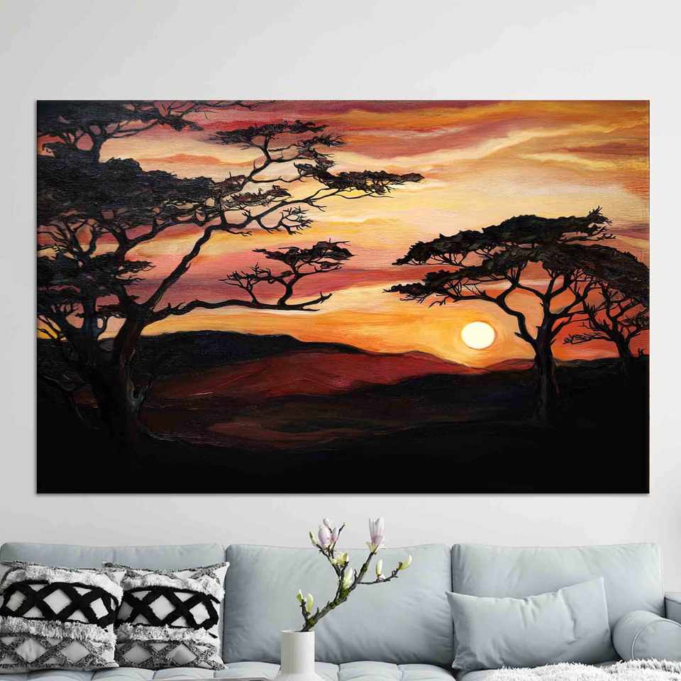 Impression sur toile Coucher de soleil à Savannah : Art paysager d'inspiration africaine, toile encollée