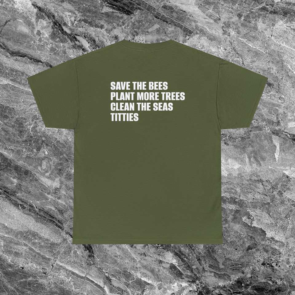 T-shirt unisexe adulte en coton à col rond et manches courtes, motif « Sauvez les abeilles, plantez des arbres, nettoyez les mers, titties », humoristique, meme, cringe, inapproprié