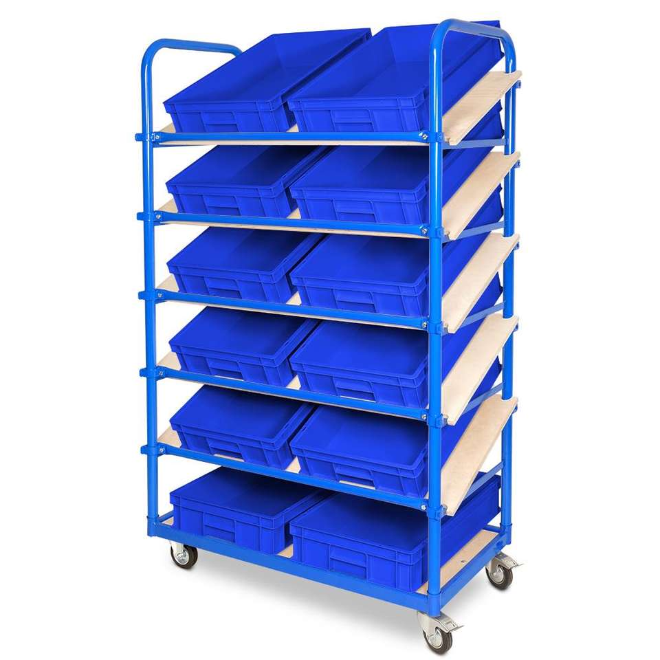 Schrägboden-Regalwagen Mit 6 Ebenen, BxTxH 1050x500x1690 Mm, 2 Lenk- (mit Feststellbremse) U. 2 Bockrollen, Bestückt Mit 12 Euro