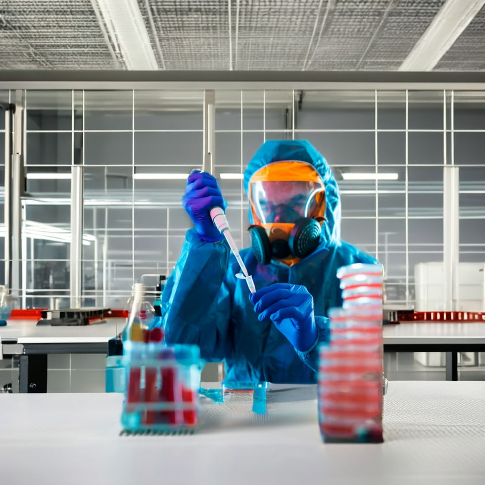 Scientifique travaillant dans un laboratoire de pointe, utilisant un microscope et une pipette, tout en portant une tenue de protection complète pour la recherche biologique.