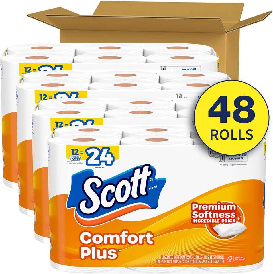 Papier toilette Scott ComfortPlus, 48 rouleaux triples, 231 feuilles par rouleau, compatible avec les fosses septiques, papier toilette 2 plis