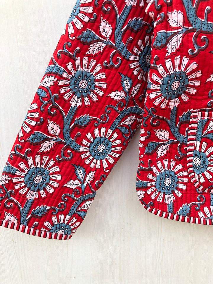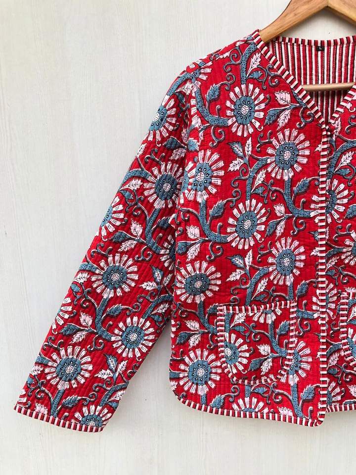 Blouson bomber matelassé en coton écologique réversible à imprimé floral, style bohème fait main, manches courtes, cadeau pour elle