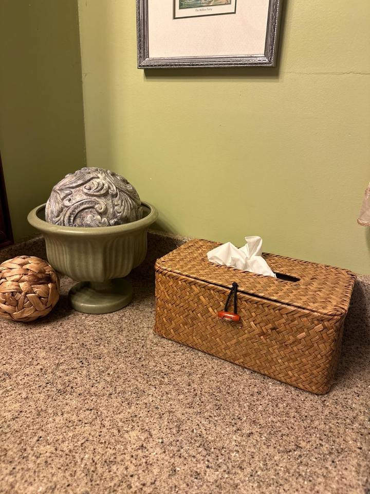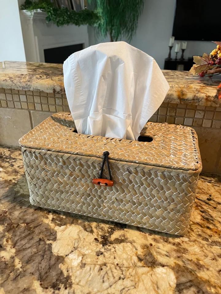 Housse de boîte à mouchoirs en jonc de mer tissée. Dimensions : L25,4 x L14 x H10,7 cm.