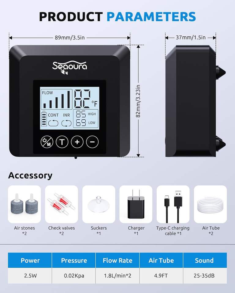 Seaoura SR-206 Pompe à Oxygène Silencieuse Intelligente pour Aquarium, Portable, Mini, Petite, Alimentée par Batterie, 2 Sorties, avec Thermomètre Numérique et Bulles