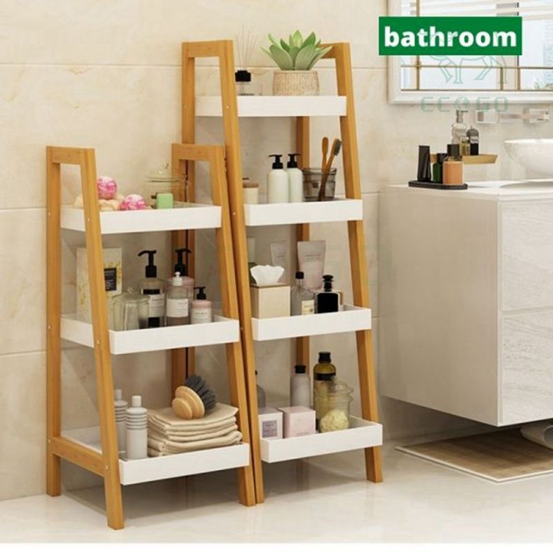 Étagère de rangement sécurisée en bambou à 4 niveaux pour la maison, conception en bois et couleur blanche Étagère de rangement robuste Étagère de salle de bain accrocheuse