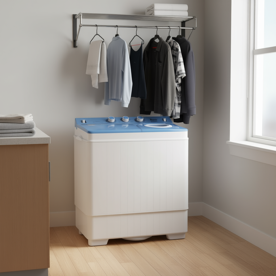 Lave-linge semi-automatique à deux cuves 26 lb blanc bleu compact électrique pour appartements, dortoirs, camping-cars