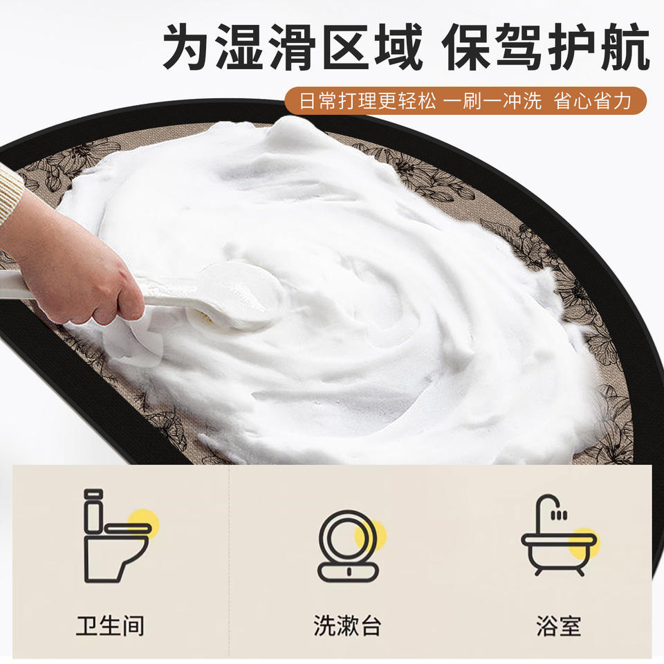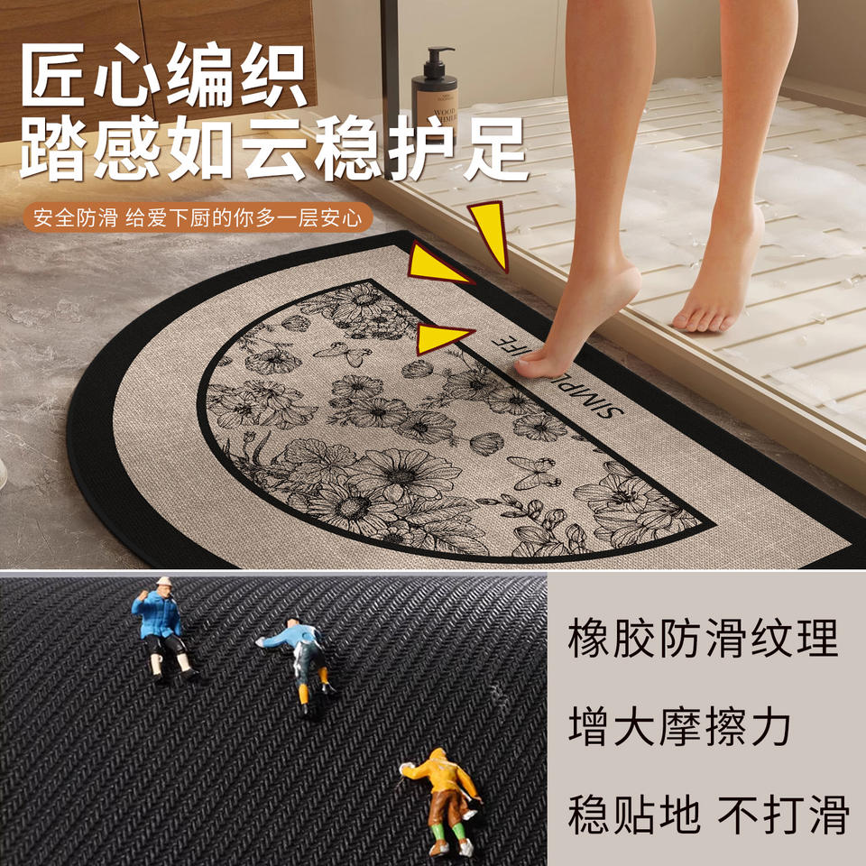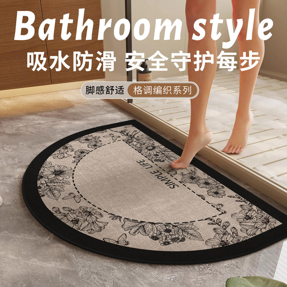 Tapis de bain semi-circulaire imitation lin à motif floral, absorbant, antidérapant, design minimaliste, couleur avoine