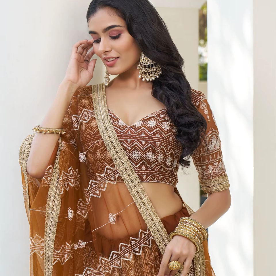 Lehenga semi-cousu en tulle avec broderie de fils et de paillettes, chemisier non cousu et dupatta en tulle brodé