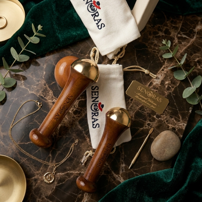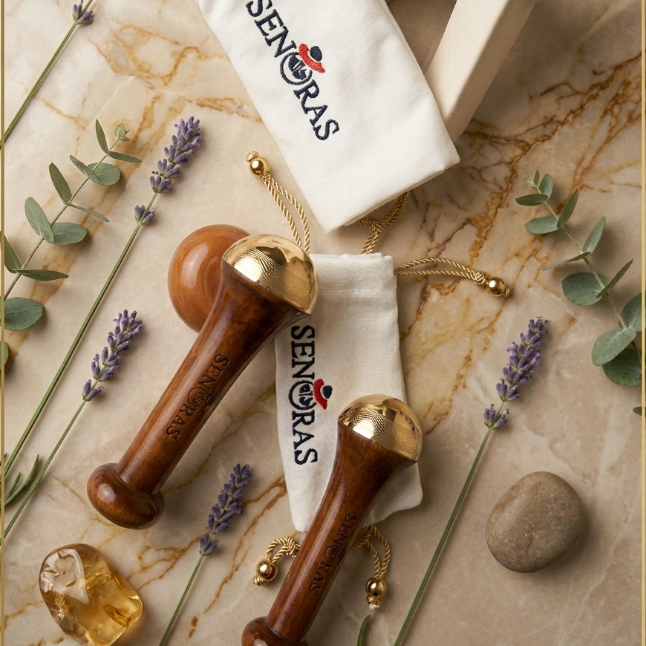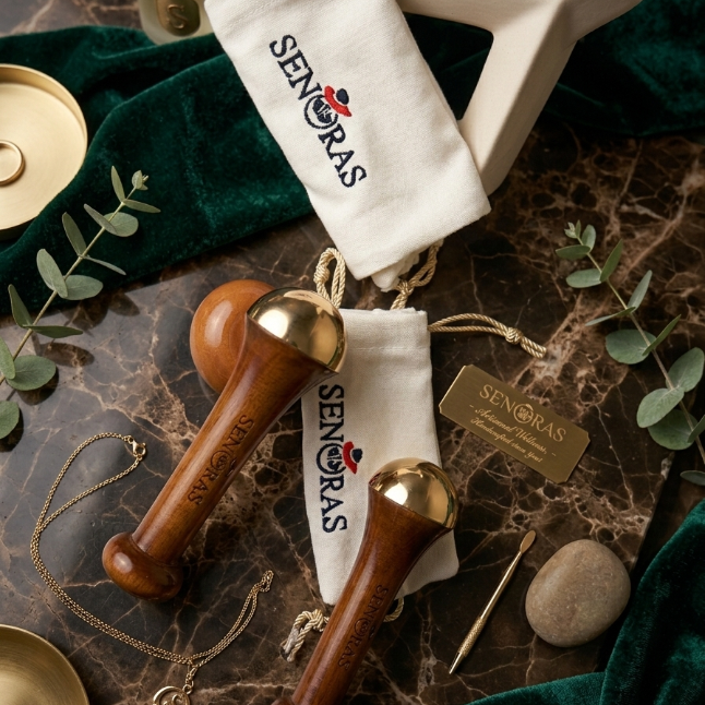 Masseur manuel pour le visage et le corps Senoras Bronze modèle 003 avec poignée en bois, raffermissant la peau, logo personnalisé