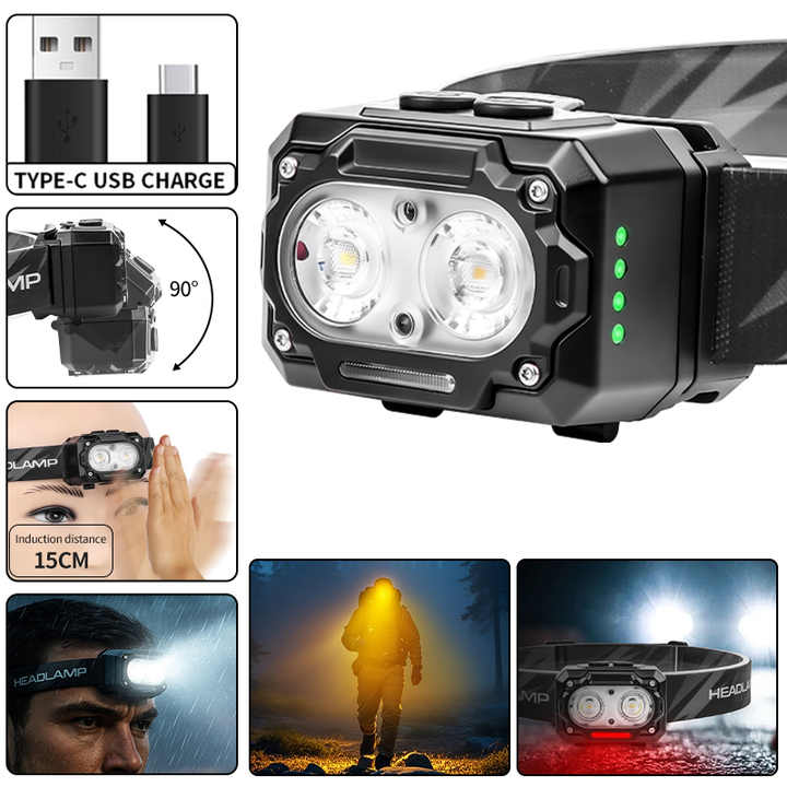 Lampe frontale à capteur avec source lumineuse double multifonctionnelle, lampes frontales d'extérieur, bandeau réfléchissant, lampe frontale, lanterne