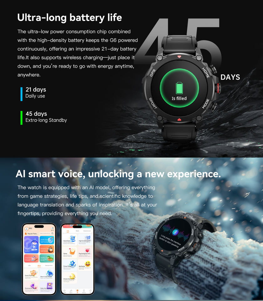 Fonction:Pisteur fitness, Boussole, Chronographe, Alarme horloge, Sommeil, Lancer essage, Fréquence cardiaque Tracker, Navigation gps, Activité Tracker, Les Médias sociaux Notifications, Assistant vocal AI