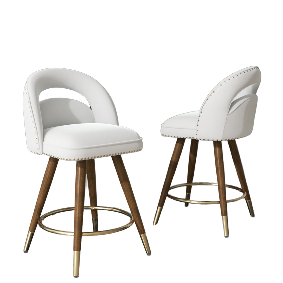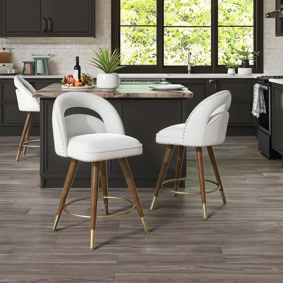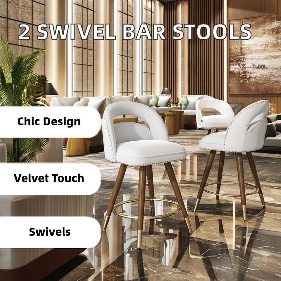 Ensemble de 2 tabourets de bar pivotants de 24 pouces à hauteur de comptoir, pieds en bois massif réglables, dos en velours, design moderne pour les repas en plein air dans un hôtel
