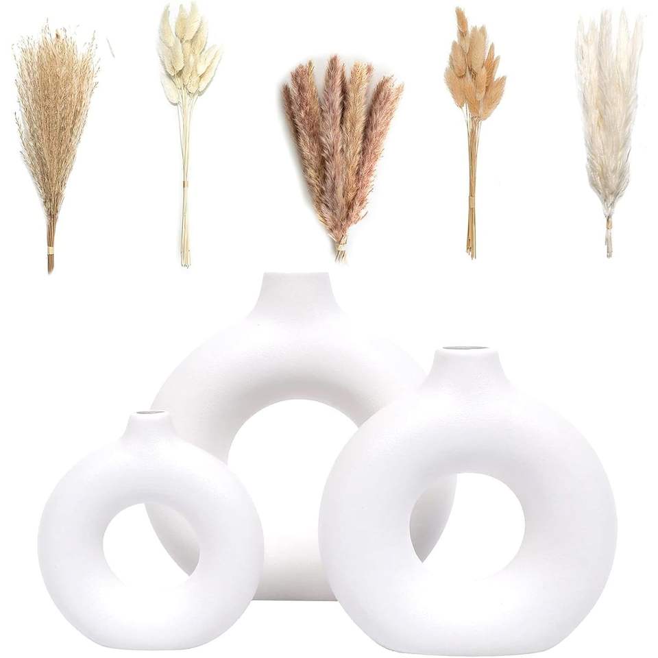 Ensemble de 3 vases en céramique blanche, 65 fleurs séchées d'herbe de la pampa, artisanat en résine esthétique bohème moderne, petits objets mignons pour la décoration du salon