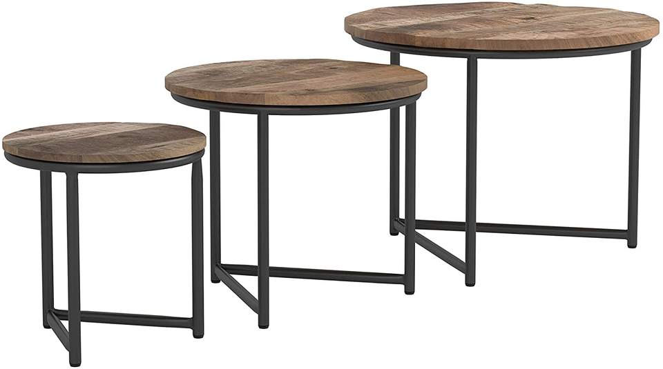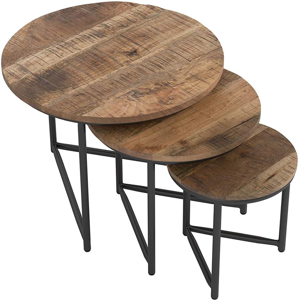 Ensemble de 3 tables basses rondes en bois de manguier massif, finition grain naturel, base en métal noir, très demandées