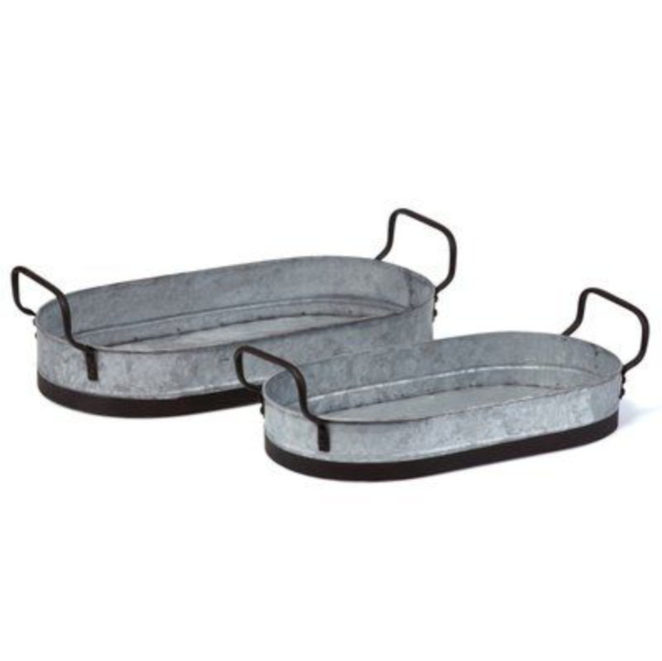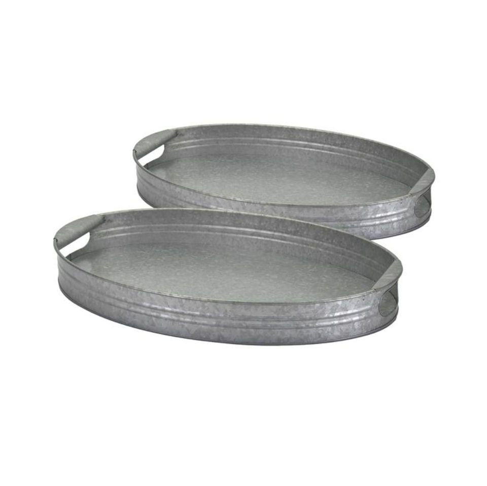 Ensemble de 2 grands plateaux de service ovales galvanisés avec poignées métalliques, élégants plateaux décoratifs en métal pour la cuisine, les fêtes et la décoration intérieure