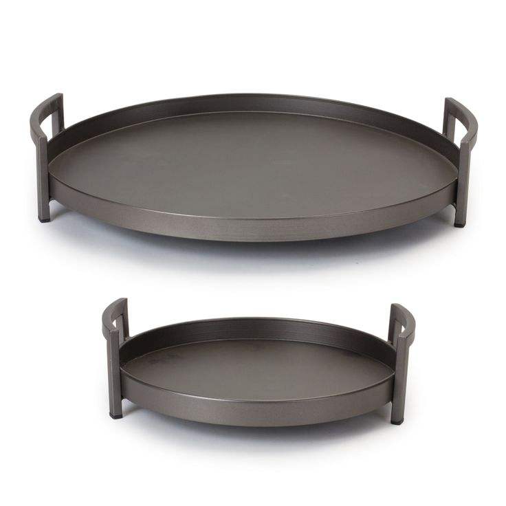 Ensemble de 2 plateaux de service ronds modernes en métal avec poignées, décoratifs, gris foncé, grand et petit, pour cuisine et table