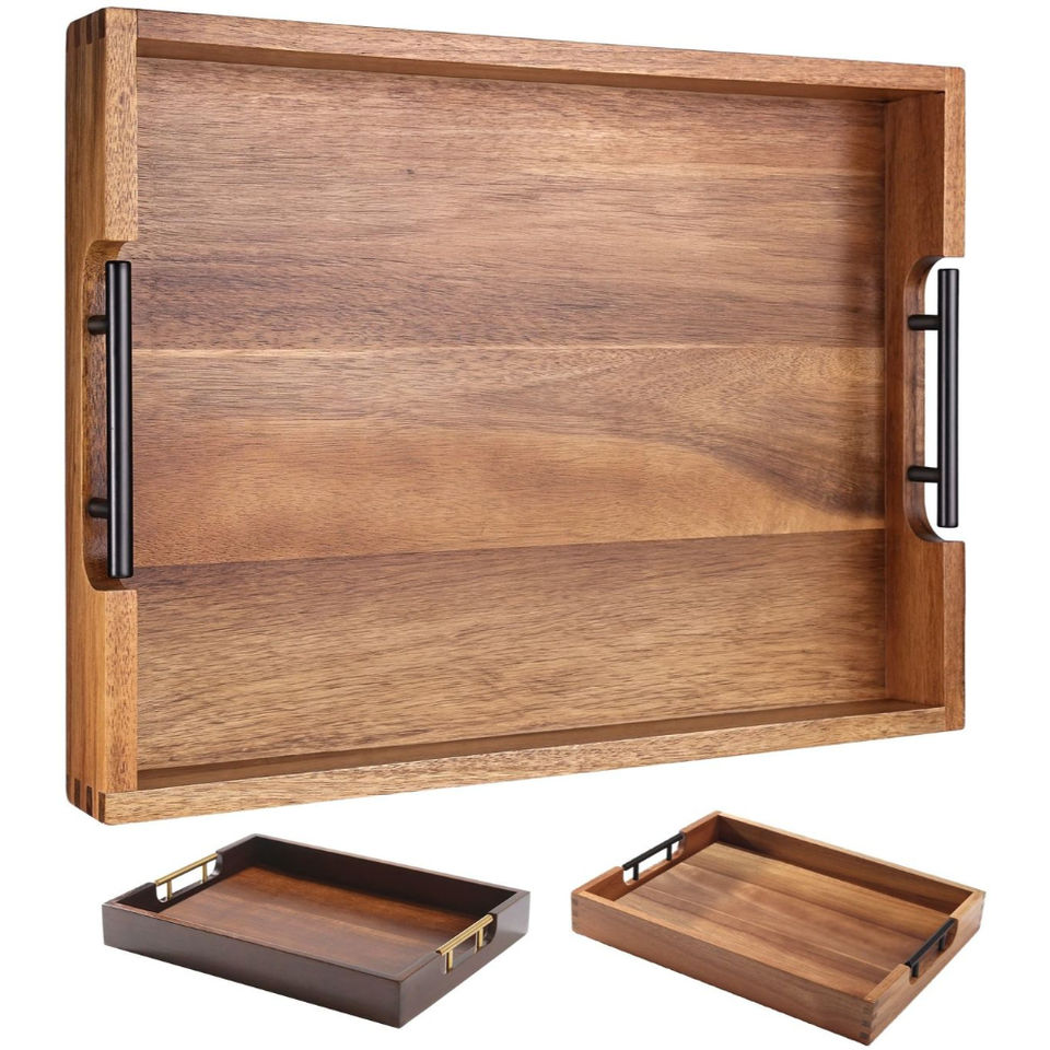 Ensemble de 2 plateaux de service rectangulaires en bois d'acacia avec poignées en acier inoxydable, plateaux de bar décoratifs modernes pour la décoration de la maison