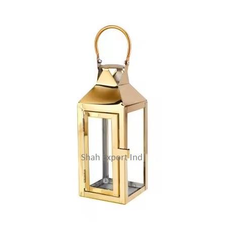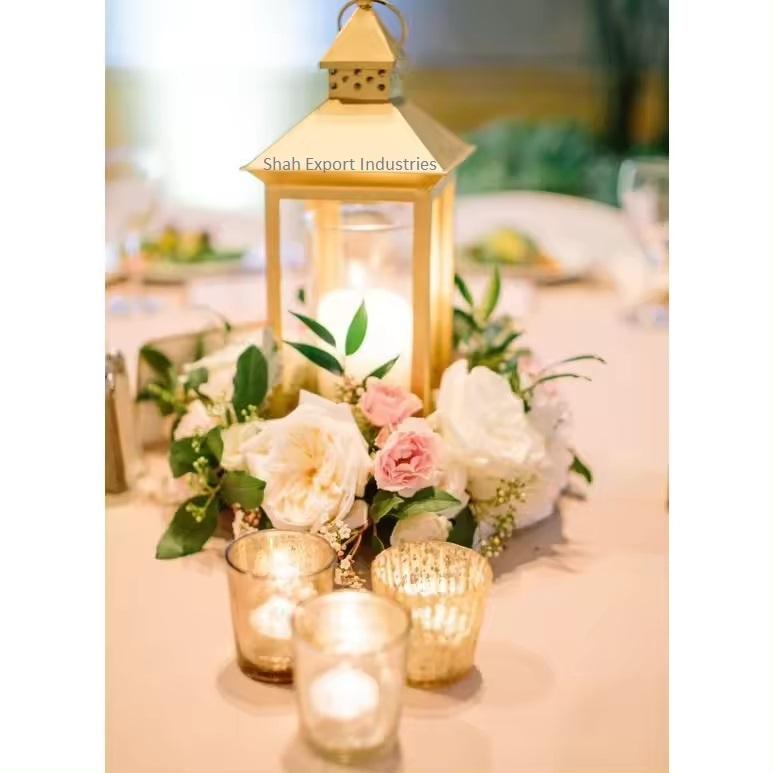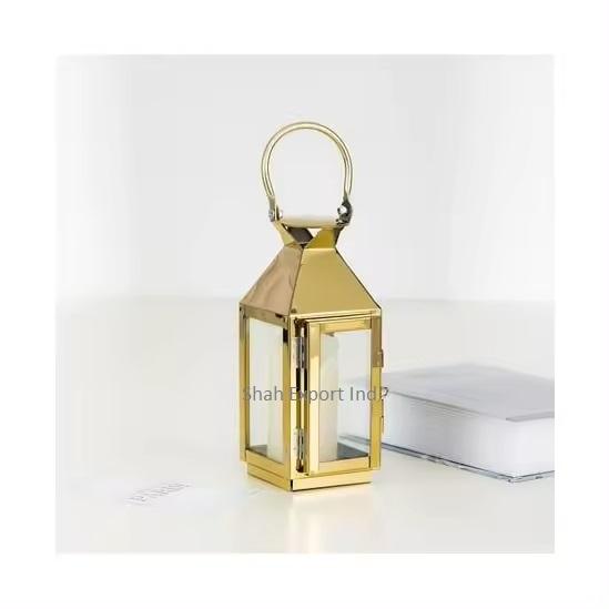 Ensemble de 2 lanternes carrées en métal/verre, écologiques, modernes, luxueuses, finition or brillant, pour la décoration de la maison, des tables de mariage, de Pâques