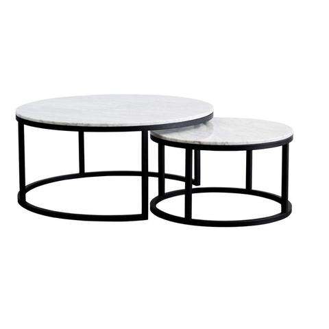 Ensemble de 2 tables basses en marbre blanc pour la décoration de la maison, du salon et des villas. Table basse en métal avec cadre noir.