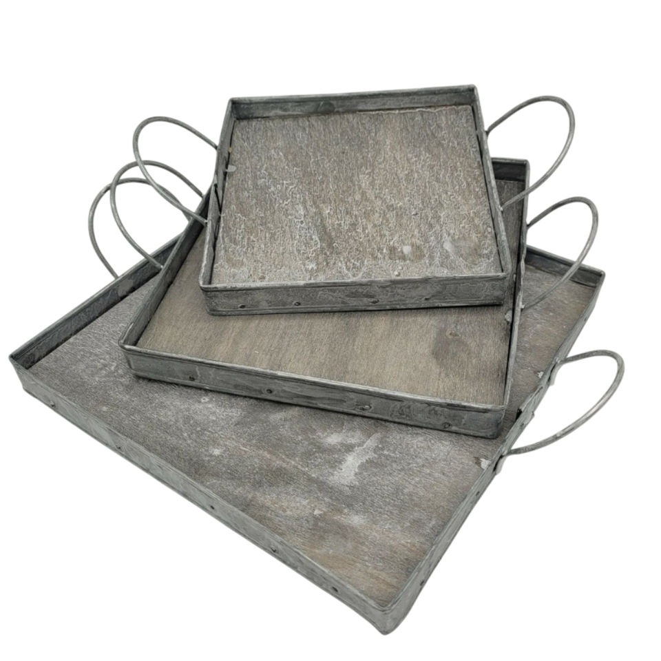 Ensemble de 3 plateaux de service gigognes en métal galvanisé avec base en bois vieilli et poignées métalliques, décoration de maison style ferme