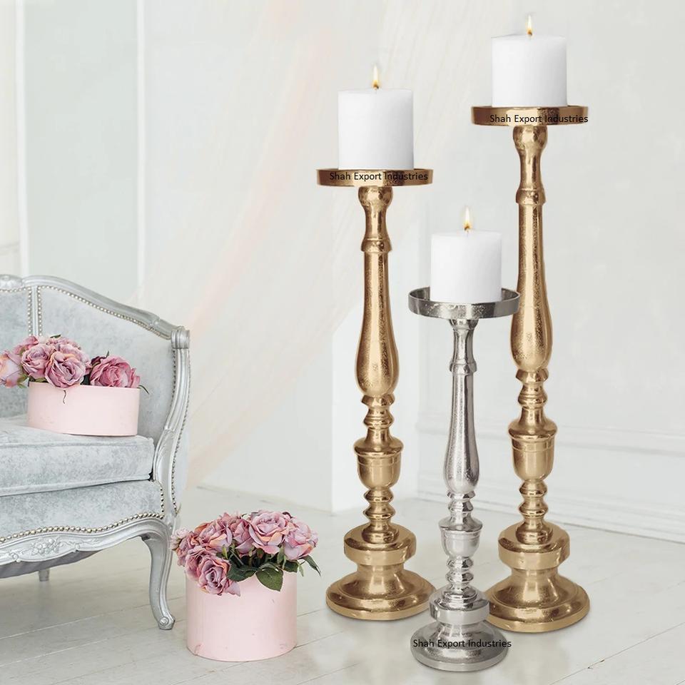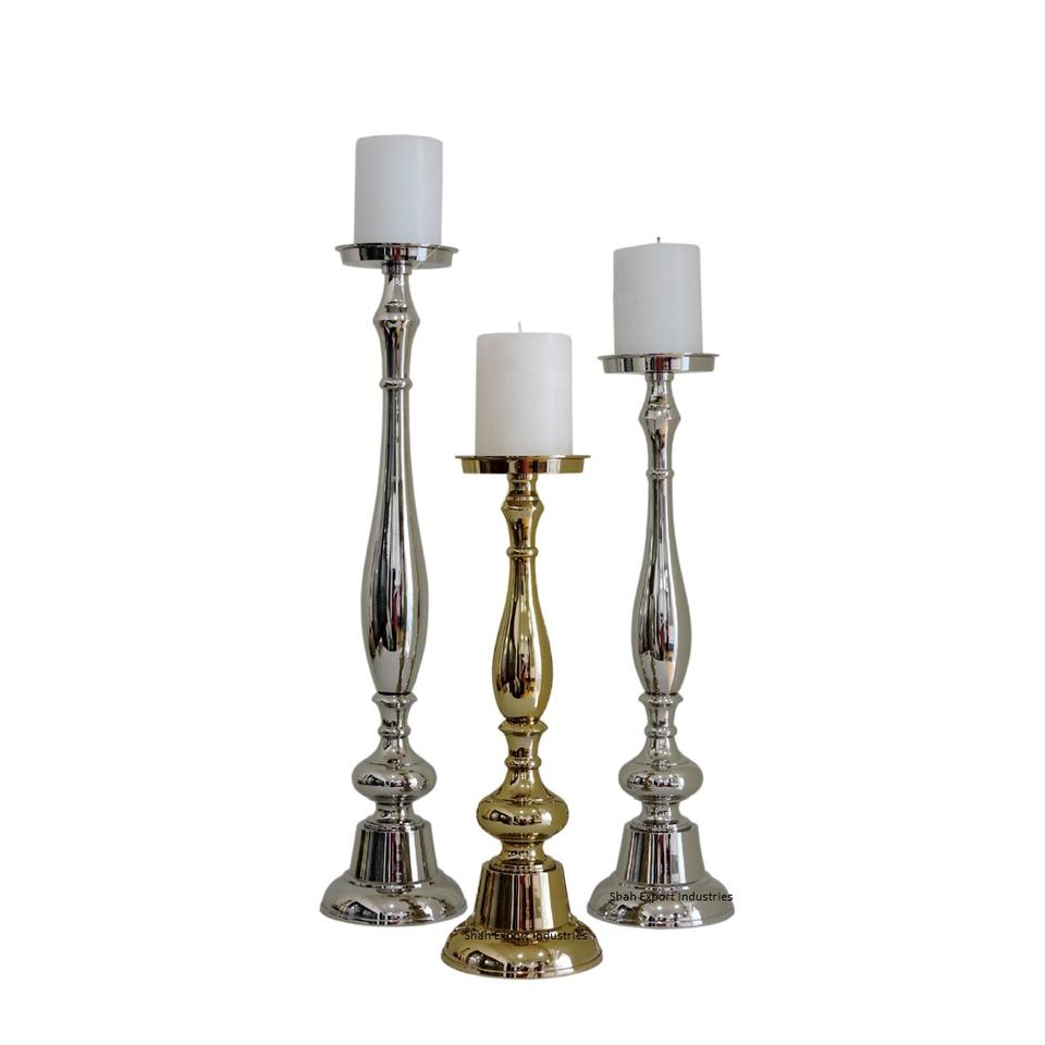 Lot de 3 bougeoirs pilier en aluminium plaqué argent et or pour décoration de table de mariage et de noël