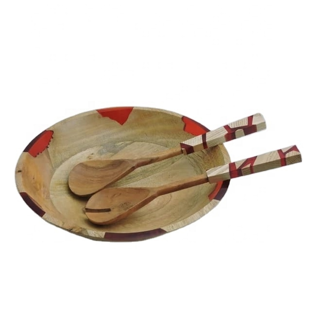 Set Of 3Pcs Enamel Print Acacia Wood Serving Bowl Different Type Food Serving Wooden Bowl Wooden Bowl For Restaurant & Wedding