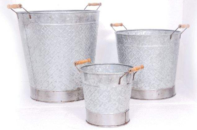 Set of Two Galvanized Planter Pots With Rope Handle Handcrafted Houseware Modern Design Decorative Flower Pots Round Shape