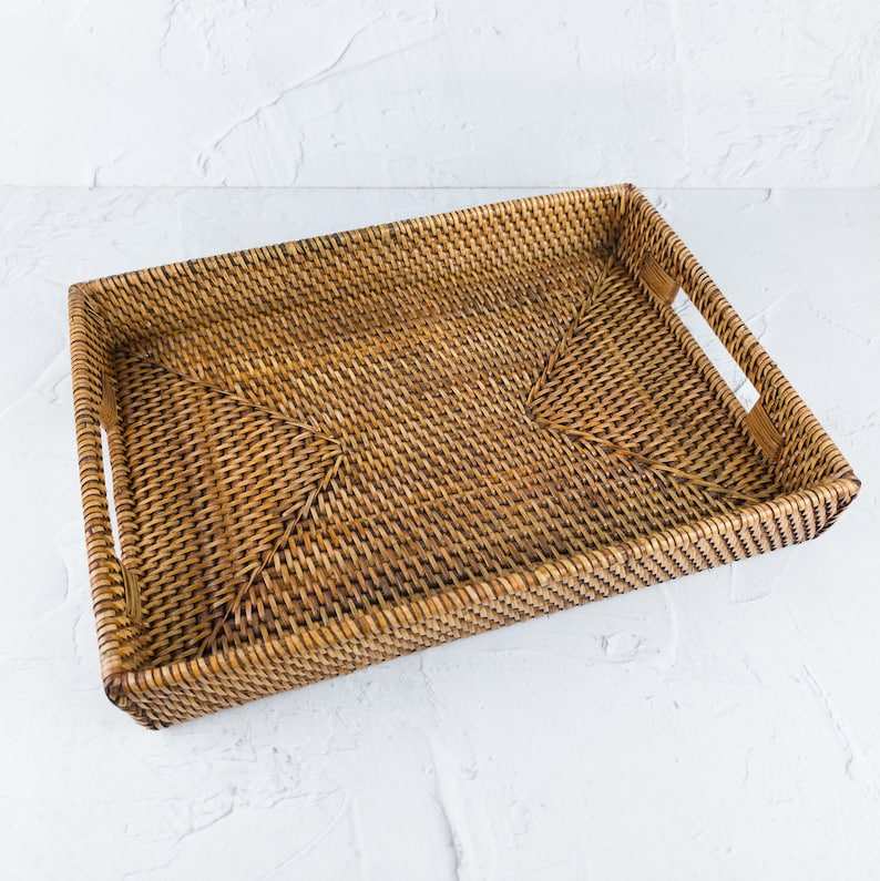 Ensemble de 2 grands plateaux en rotin avec bordure métallique et design unique, parfaits pour servir des aliments et présenter des desserts