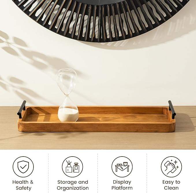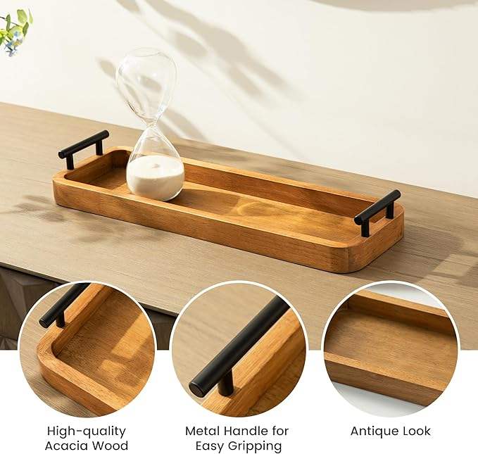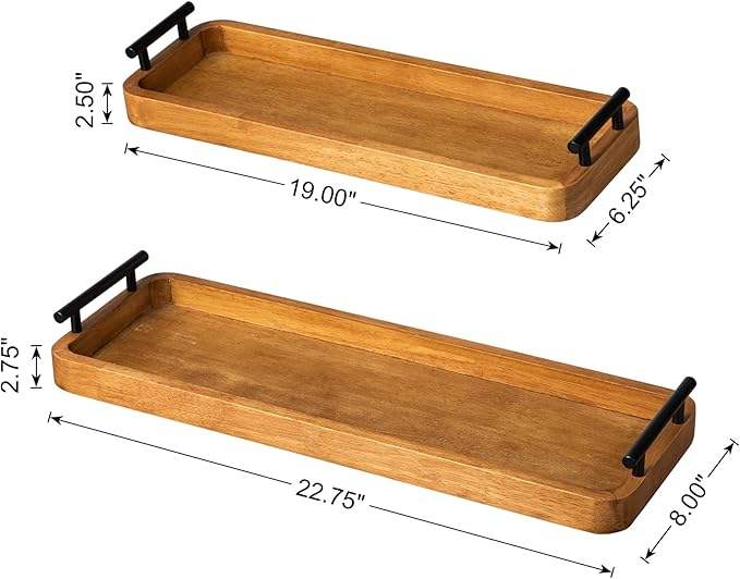 Set of 2 Oversized Acacia Wood Serving Trays with Metal Handles Vintage Decorative Rectangular Centerpiece Trays