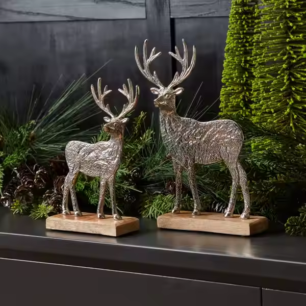 Ensemble de 2 pièces décoratives pour la maison en métal moderne texturé argenté, faites à la main et écologiques, représentant des mini-elandes et des rennes, par Decor Impex