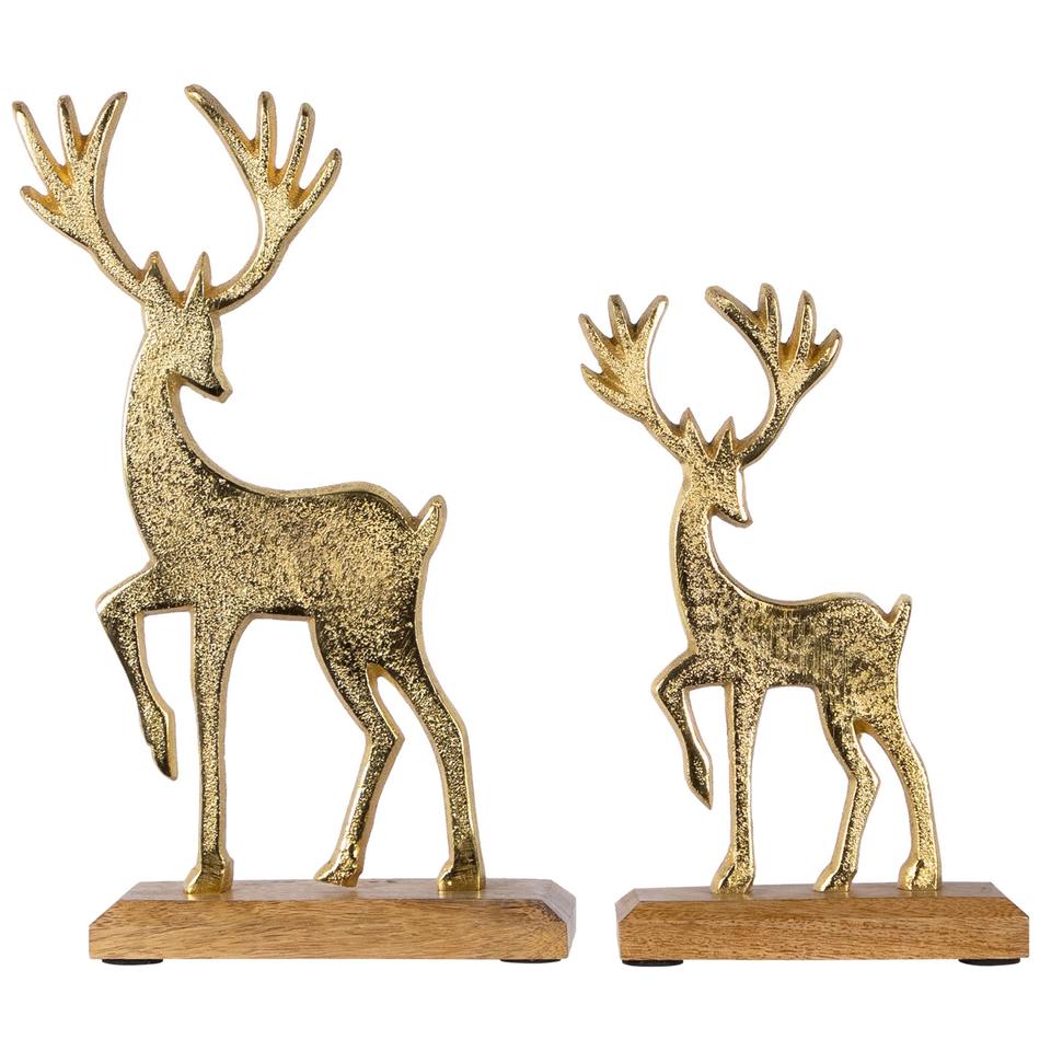 Ensemble de 2 figurines de cerfs dorés texturés pour Diwali et décoration de Noël | Une paire de rennes et de faons rustiques modernes sur un socle en bois