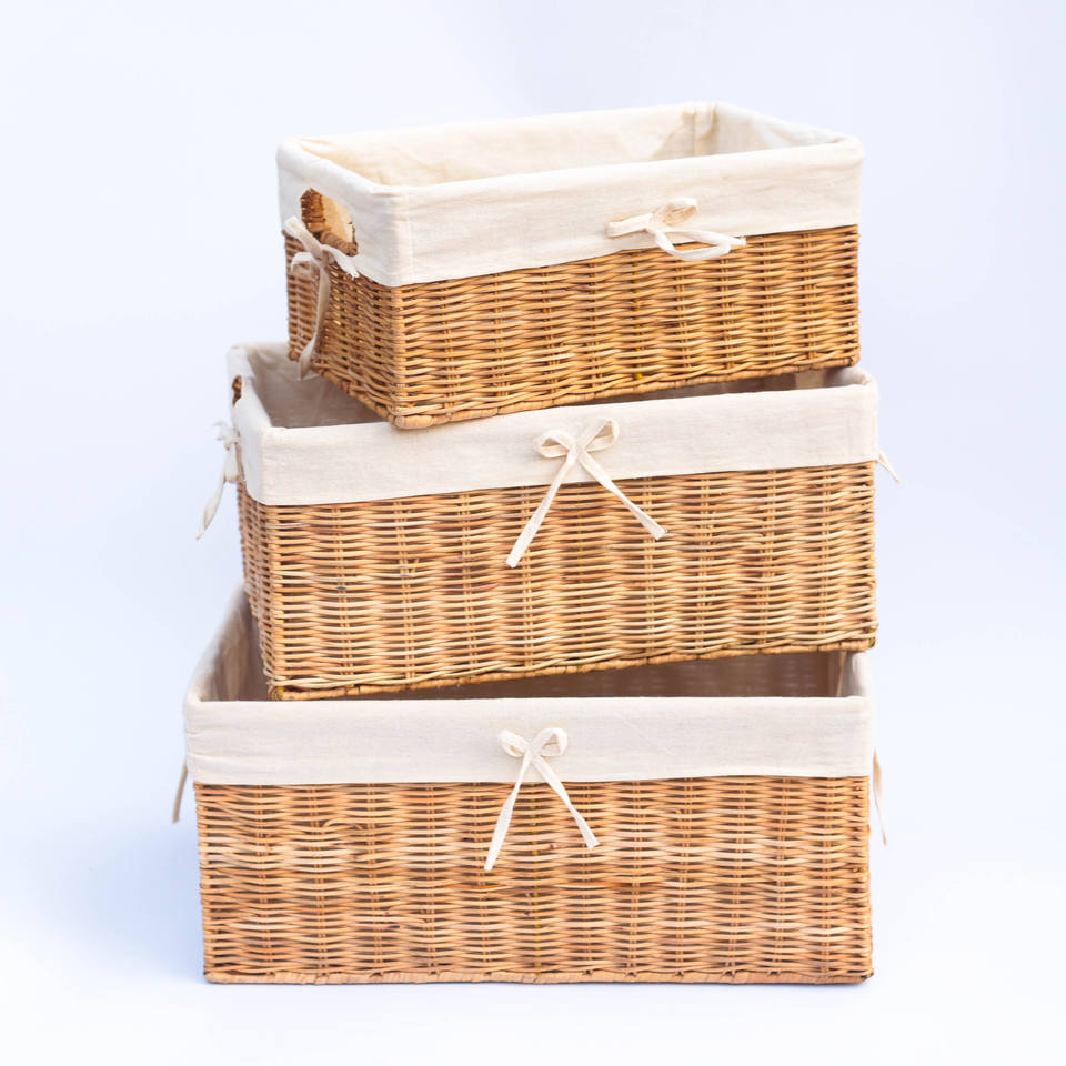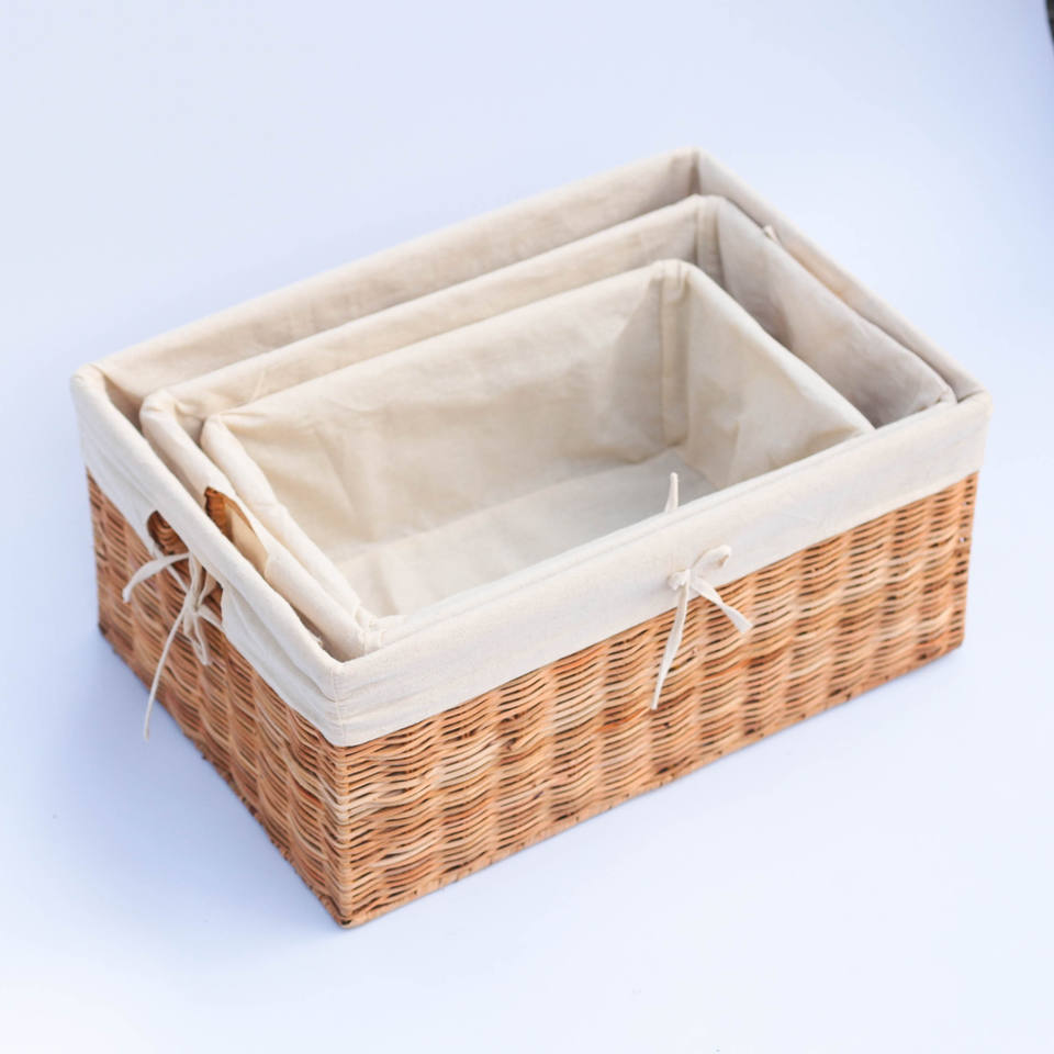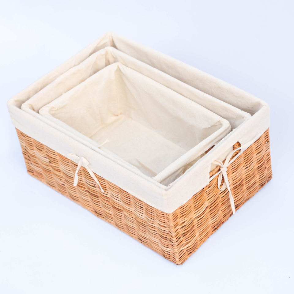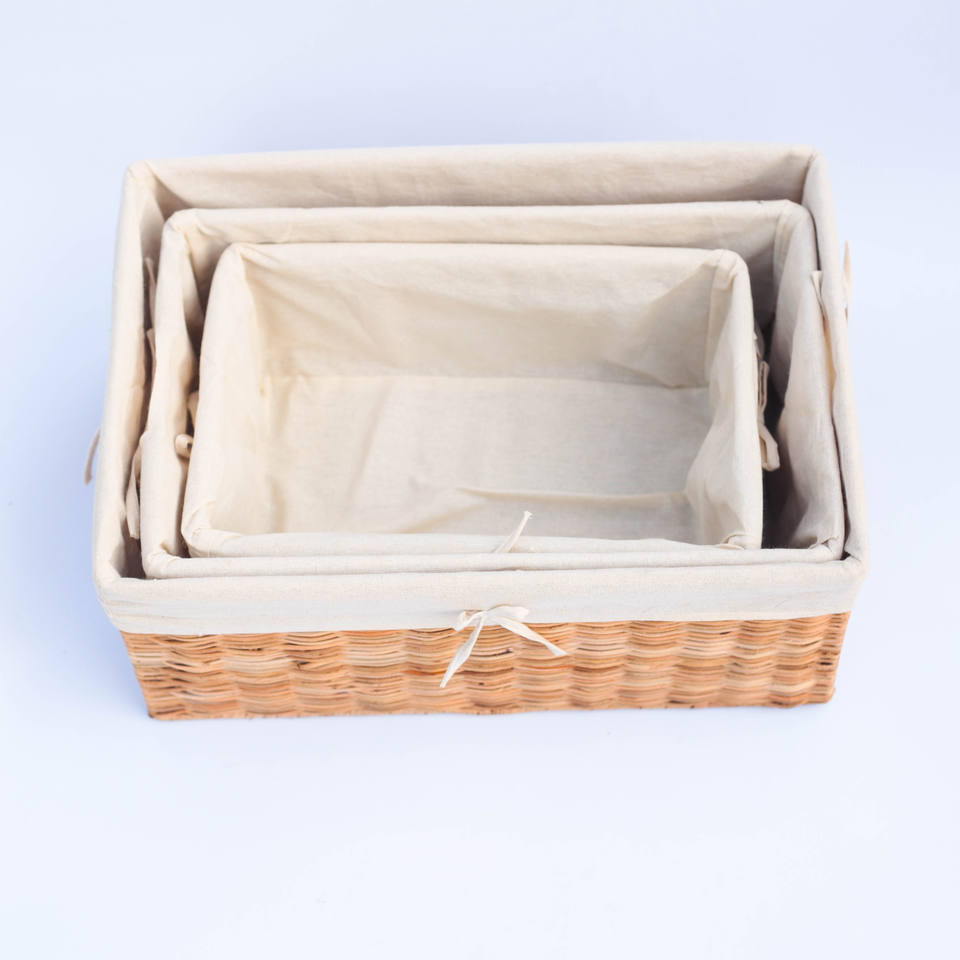 Ensemble de 3 paniers rectangulaires en osier tressé avec doublure en toile - Plateaux de rangement en osier de style minimaliste polyvalent, ensemble de paniers de rangement