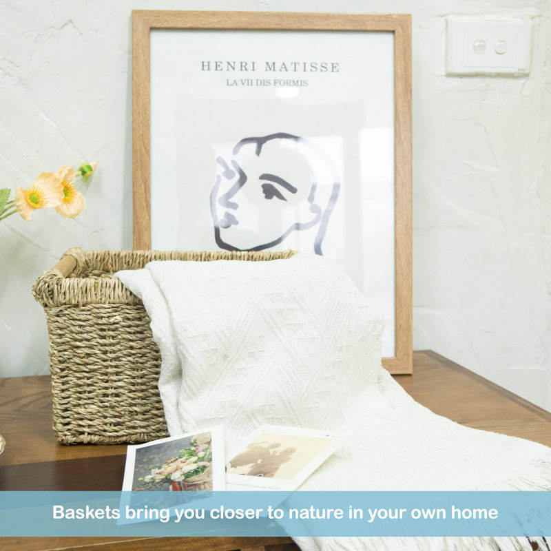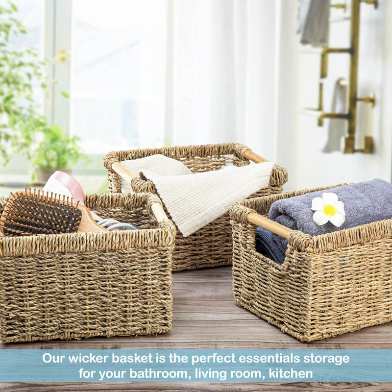 Set of 3 Seagrass Storage Baskets with Wooden Handles Decorative Wicker Organizers for Bathroom or Kitchen