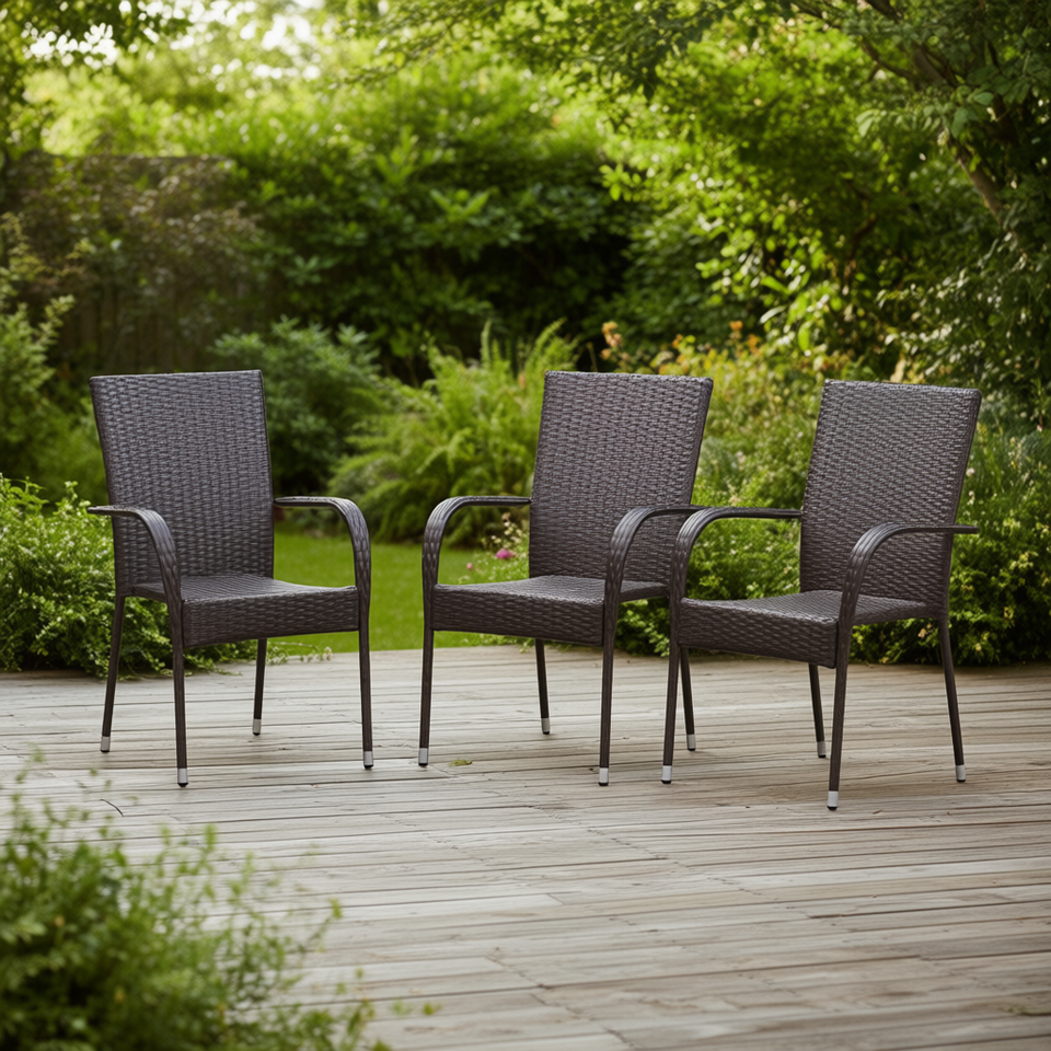 Chaises de salle à manger d'extérieur en rotin PE, cadre en acier thermolaqué marron, ensemble de 4 meubles de jardin contemporains