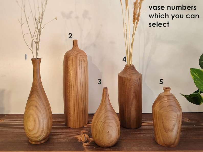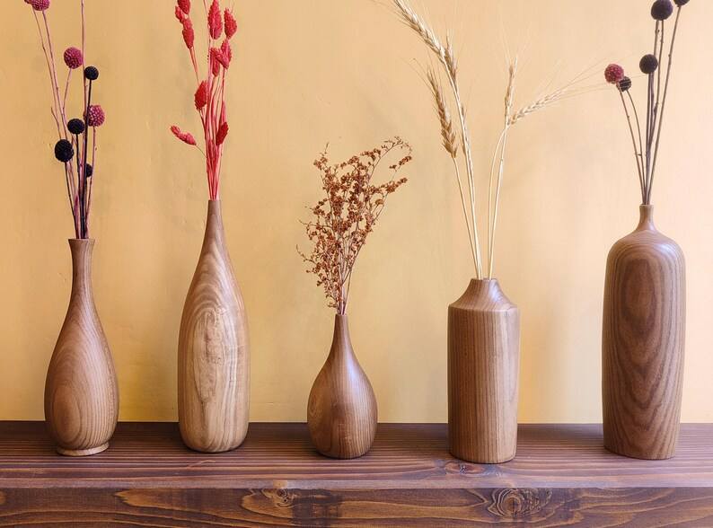 Set of 5 Handcrafted Wooden Vases Unique Elmwood Flower Pots Decorative Centerpiece Art