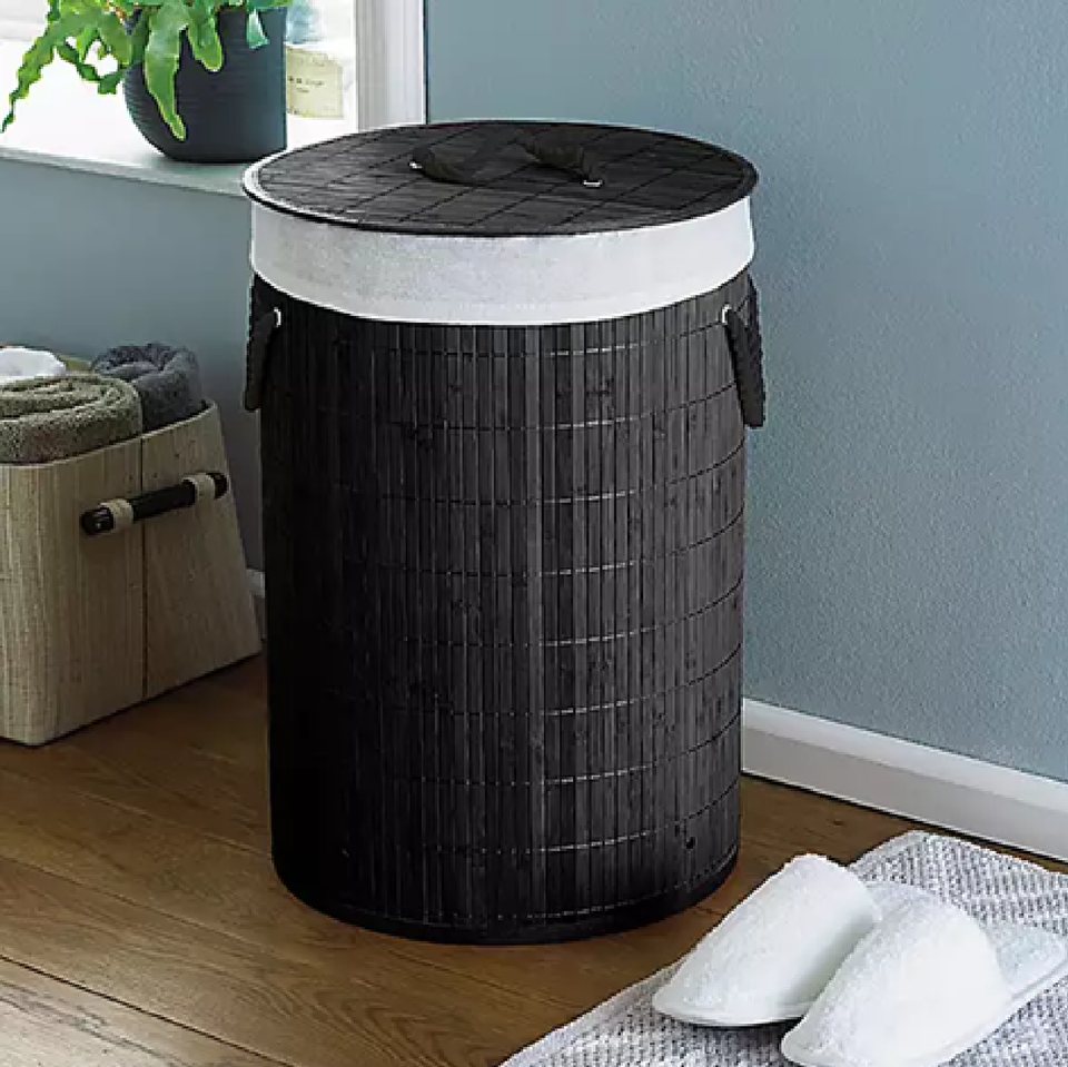 Lot de deux paniers à linge tressés rectangulaires en blanc et gris. Disponible aux prix de gros.