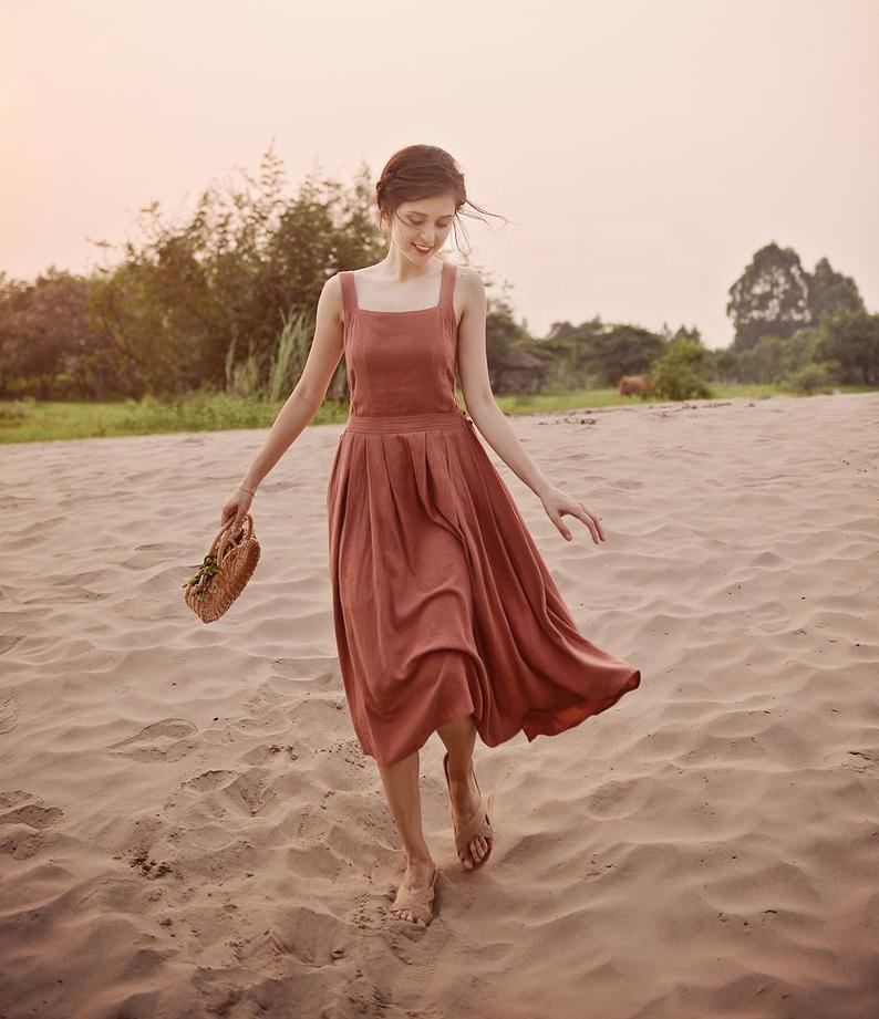 Robe tablier marron pour femmes, en lin, avec bouton latéral et col carré, tenue décontractée, fait à la main, nouvelle collection,